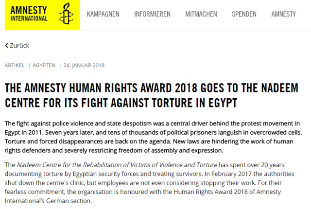 أعلنت منظمة العفو الدولية بألمانيا عن منح مركز النديم لمناهضة العنف والتعذيب جائزة حقوق الإنسان لعام ٢٠١٨، وقالت المنظمة في البيان المنشور على موقعها أنه بمناسبة الذكرى السابعة لثورة يناير فإن منظمة العفو تقف موقفا حاسما أمام ممارسات التعذيب في مصر من خلال منح النديم جائزة حقوق الإنسان في نسختها التاسعة والتي سيتم تسليمها في حتفال تقيمه المنظمة بمسرح فولكسبون بالعاصمة الألمانية برلين.